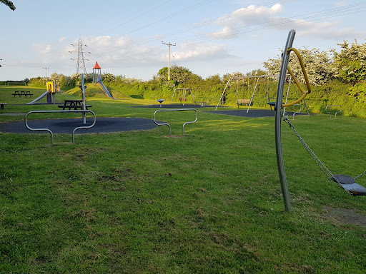 This playground is a lovely, safe space for children to explore and play freely. It features a variety of play equipment, including slides and a unique spiderweb swing. The park also offers natural elements with wooded walkways and dens, providing imaginative play opportunities. A large field adjacent to the play area is perfect for games like football, and there is ample seating for families to relax.