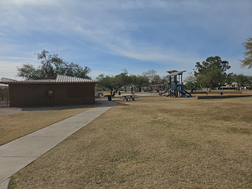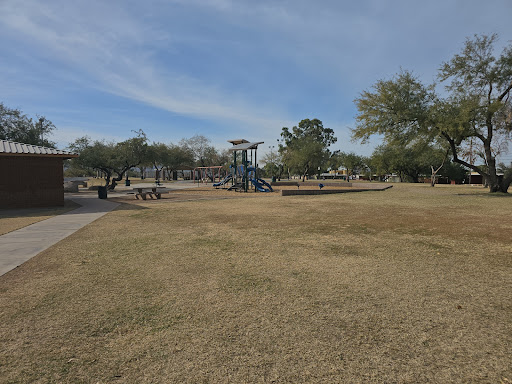 This playground is part of a nice park featuring convenient restrooms and access to a bike loop, offering amenities for both active play and leisurely strolls.