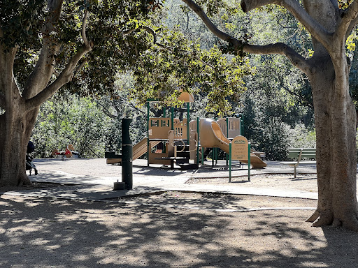 This nice little playground offers two slides and a charming horse on a spring, perfect for younger children. It features three sets of benches for parents to relax, along with convenient water fountains catering to children, adults, and even pets, making it a thoughtful spot for a quick visit.