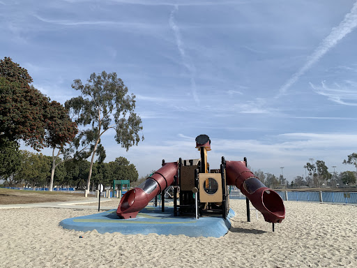 This playground offers a unique ship-themed design, with one structure distinctly shaped like a ship, providing an imaginative play experience for children. It consists of a collection of three smaller playgrounds conveniently located next to a lake. The park offers abundant parking options in various spots, making access easy for families looking for an outdoor play area.