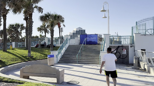 Breakers Oceanfront Park offers a convenient beachfront location with direct access to the boardwalk and pier, providing beautiful views and opportunities for leisurely strolls or bike rides. Families can enjoy the splash pad, a fun water feature for kids, and benefit from available restrooms, drinking fountains, and benches. The park provides ample open space and is well-lit for evening visits.