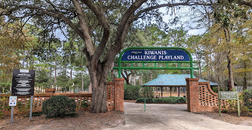 Kiwanis Challenge Playground offers a peaceful setting with distinct play areas for toddlers and older children, including a large playground structure. Visitors can enjoy a mostly shaded walking track perfect for running, as well as a basketball court and open green spaces. A covered pavilion with seating provides a great spot for gatherings, and clean restrooms are available.