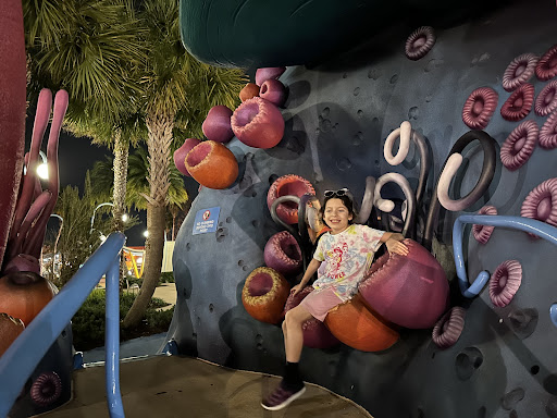 Righteous Reef Playground is a delightful and engaging play area, offering three slides and several tunnels for children to explore. Its location next to a splash park provides an added element of water fun, making it a highly appealing spot for kids to enjoy. The design encourages imaginative play like hide-and-seek, providing a convenient and entertaining option for families.