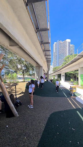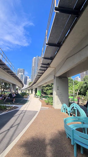 The Underline Hammock Playground is a highly rated and versatile play space that offers a variety of engaging equipment, including swings, a climbing frame, and a slide. A unique feature is the dedicated cycle path, allowing children to safely practice cycling. This playground is a welcoming addition to the city, fostering a good atmosphere among visitors within an appealing urban setting.