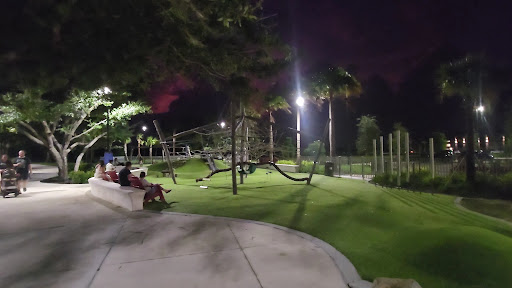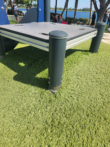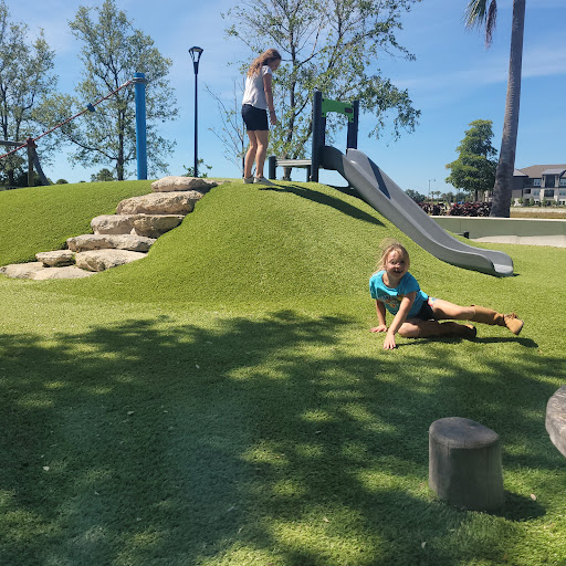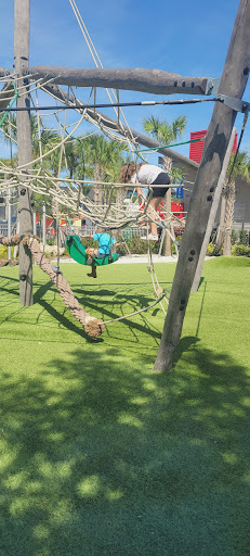 Downtown Wellen Playground is a clean, safe, and well-maintained park featuring a splash pad, various climbing structures, swings, and slides. Families appreciate the comfortable shaded seating areas and the soft artificial turf surface. Its location within Downtown Wellen provides convenient access to restrooms and nearby food vendors, making it a great spot for an extended outing. The unique design, including turf mounds, offers engaging play opportunities for a range of ages.
