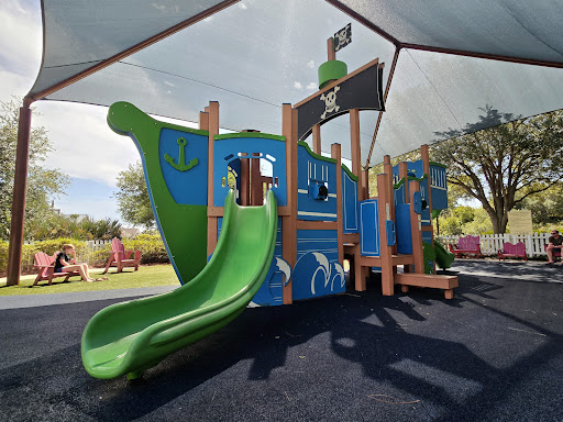 Shaded playSafety and cleanlinessPirate themeModern/safe materialsParent comfort and visibilityAdjacent nature trail
