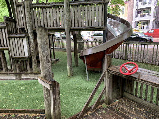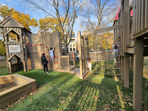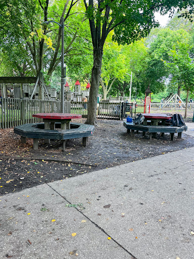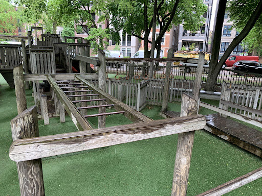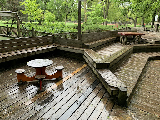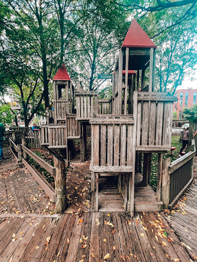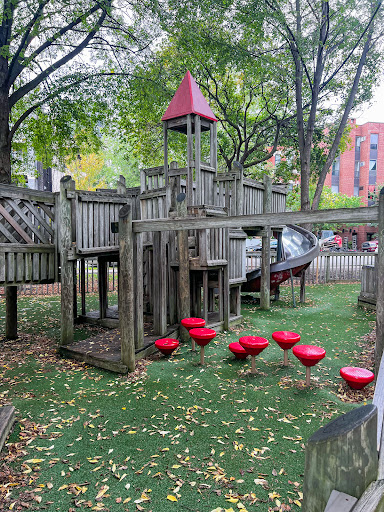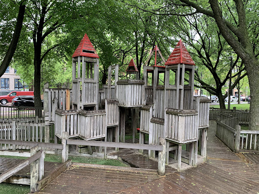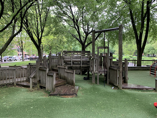 Dorothy’s Playground at Oz Park is a truly unique destination, featuring a sprawling, multi-level wooden play structure that encourages imaginative climbing and exploration. Families will enjoy the numerous slides and swings, as well as the enchanting Wizard of Oz character statues scattered throughout the park. The playground offers ample seating with benches and picnic tables, and is fully enclosed and heavily shaded by large trees, providing a comfortable and secure play environment.