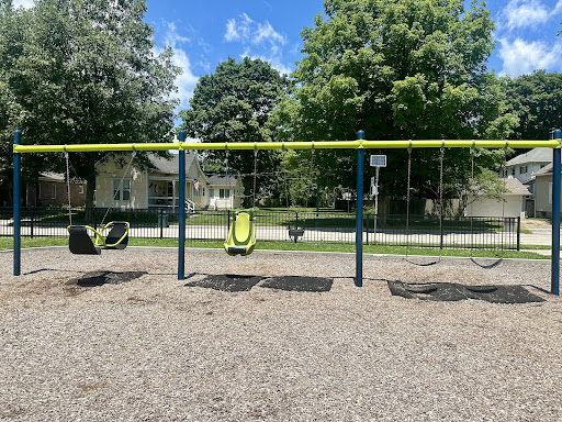 Kathleen J. Steele Playground is a nicely updated park featuring distinct play structures, including a smaller playset ideal for toddlers and a larger one designed for climbing. The swingset stands out with its variety, offering regular, baby, handicap-accessible, and 2-person swings. Families can also enjoy a central gazebo with picnic tables and a small basketball court, making it a well-rounded and appealing destination.