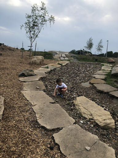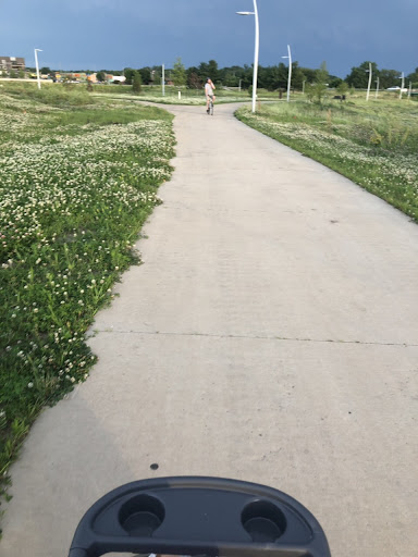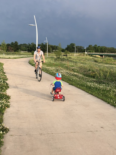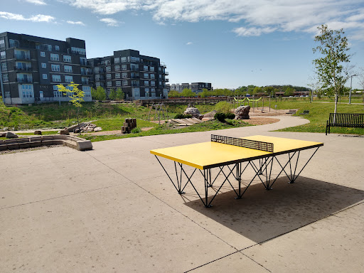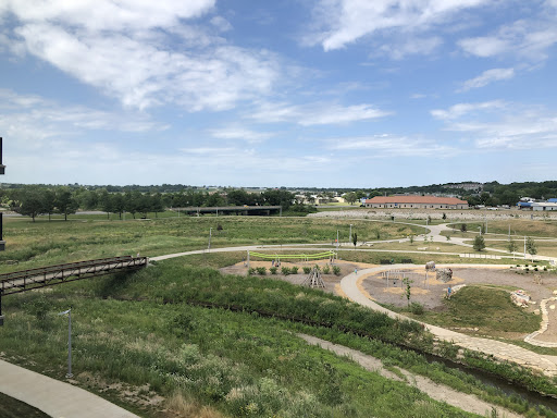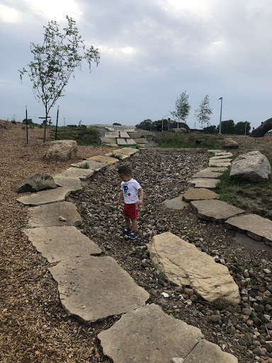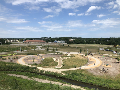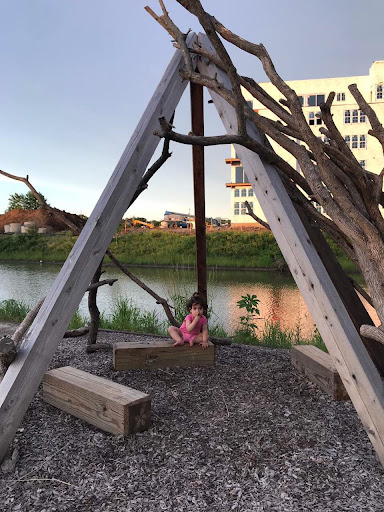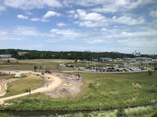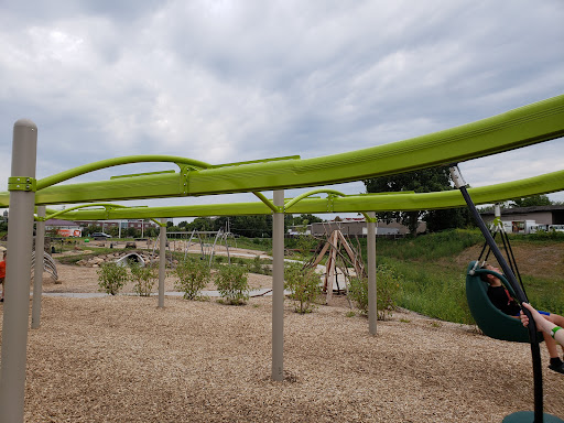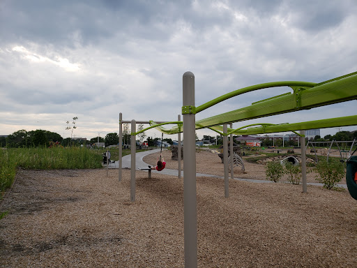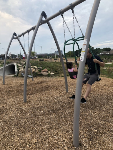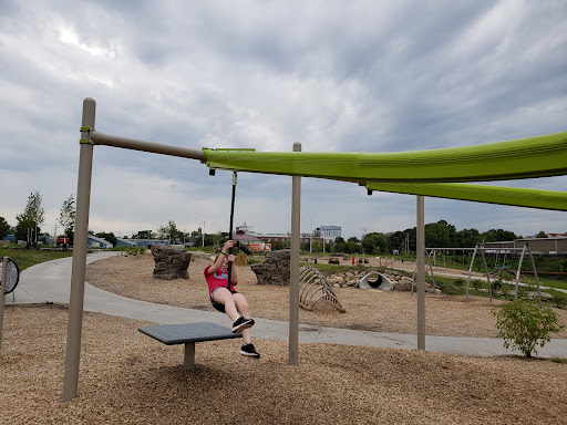 Riverfront Crossings Park is celebrated for its exciting zipline, a highlight for children and adults alike, and its interesting play area with climbing structures. The park offers wide, flat paved paths perfect for walking and biking, providing pleasant views of the nearby river and lake. Visitors can enjoy the convenience of clean restrooms, ample benches for relaxation, and good lighting that enhances safety for evening strolls. Its urban setting, close to food vendors, makes it an easily accessible and enjoyable destination.