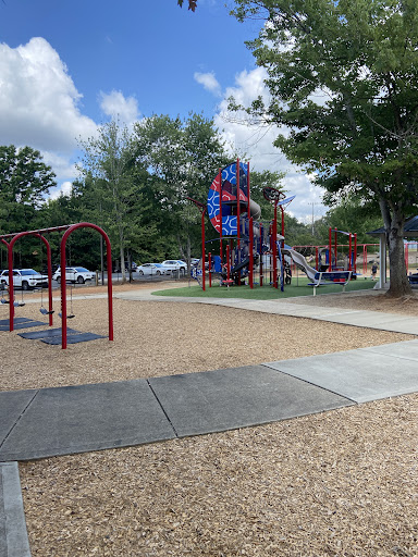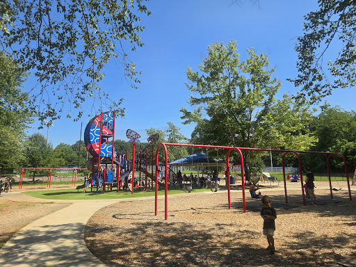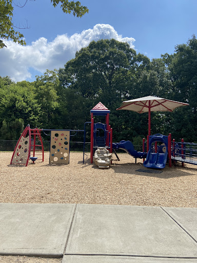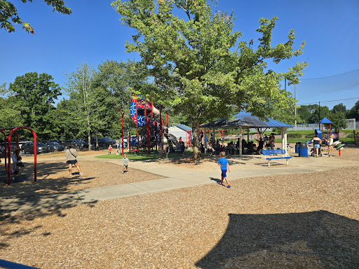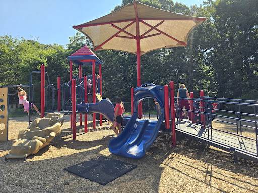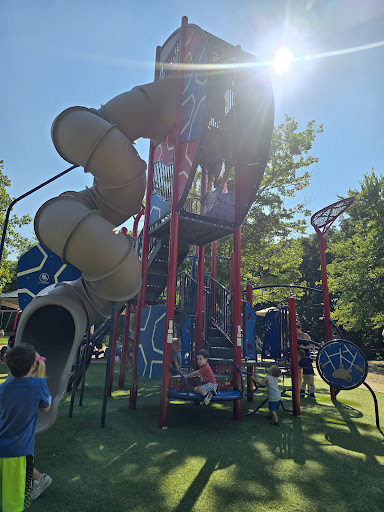 This highly-rated playground offers a secure and enjoyable experience for families, being entirely fenced in with excellent visibility for parents. It features multiple play areas, including a large section with a tall slide for older children and smaller zones suitable for younger kids. Visitors can enjoy the shade provided by numerous trees and relax on benches throughout the park, all connected by paved sidewalks.