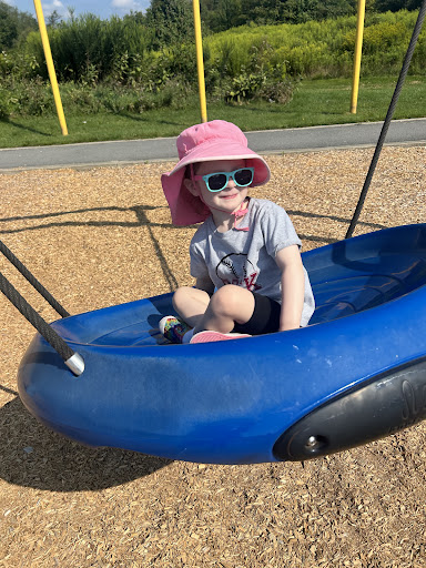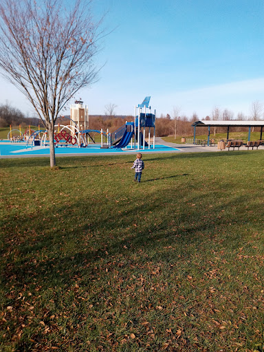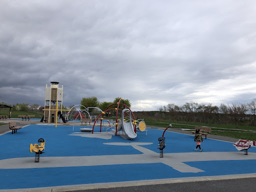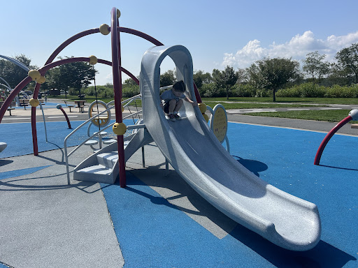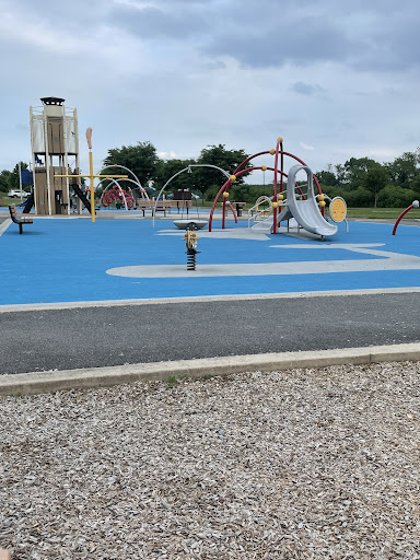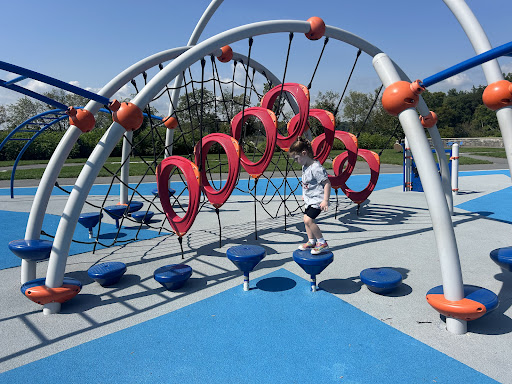 This spacious and clean airport-themed playground offers a unique and engaging experience for children from toddlers up to school age. Kids enjoy the soft, squishy blue turf, diverse equipment including slides, swings, monkey bars, and a distinctive tower, as well as plenty of room to run and a bike path. The imaginative design and ample space make it a favorite for active families.