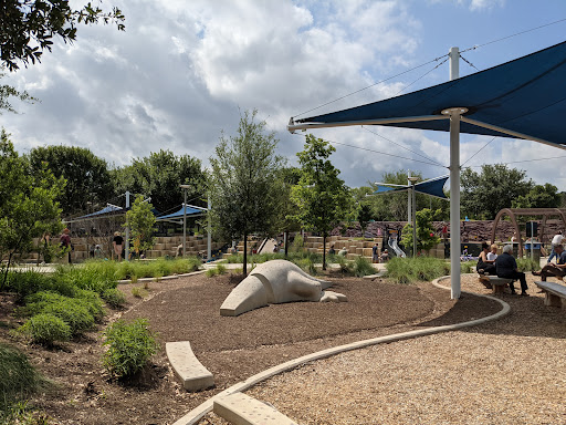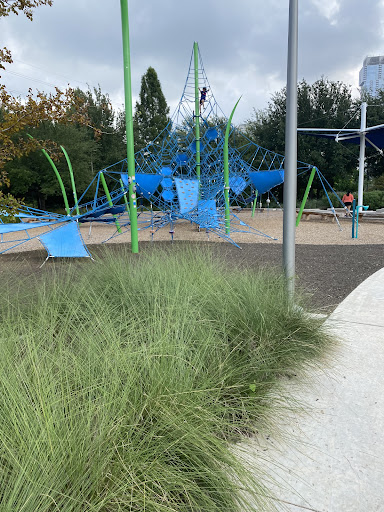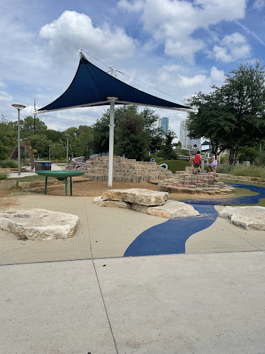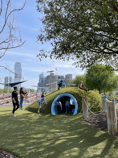 Auditorium Shores Playground is a truly unique and epic play destination featuring an expansive layout with distinct play areas, including popular slides, swings, and a sand pit. Children can explore a fantastic 3-story climbing structure, engage with unique musical instruments, and utilize a challenging rock climbing wall. The park also offers plenty of walking paths, benches, and green spaces to relax while enjoying breathtaking downtown views, making it appealing for kids of all ages from toddlers to teens.